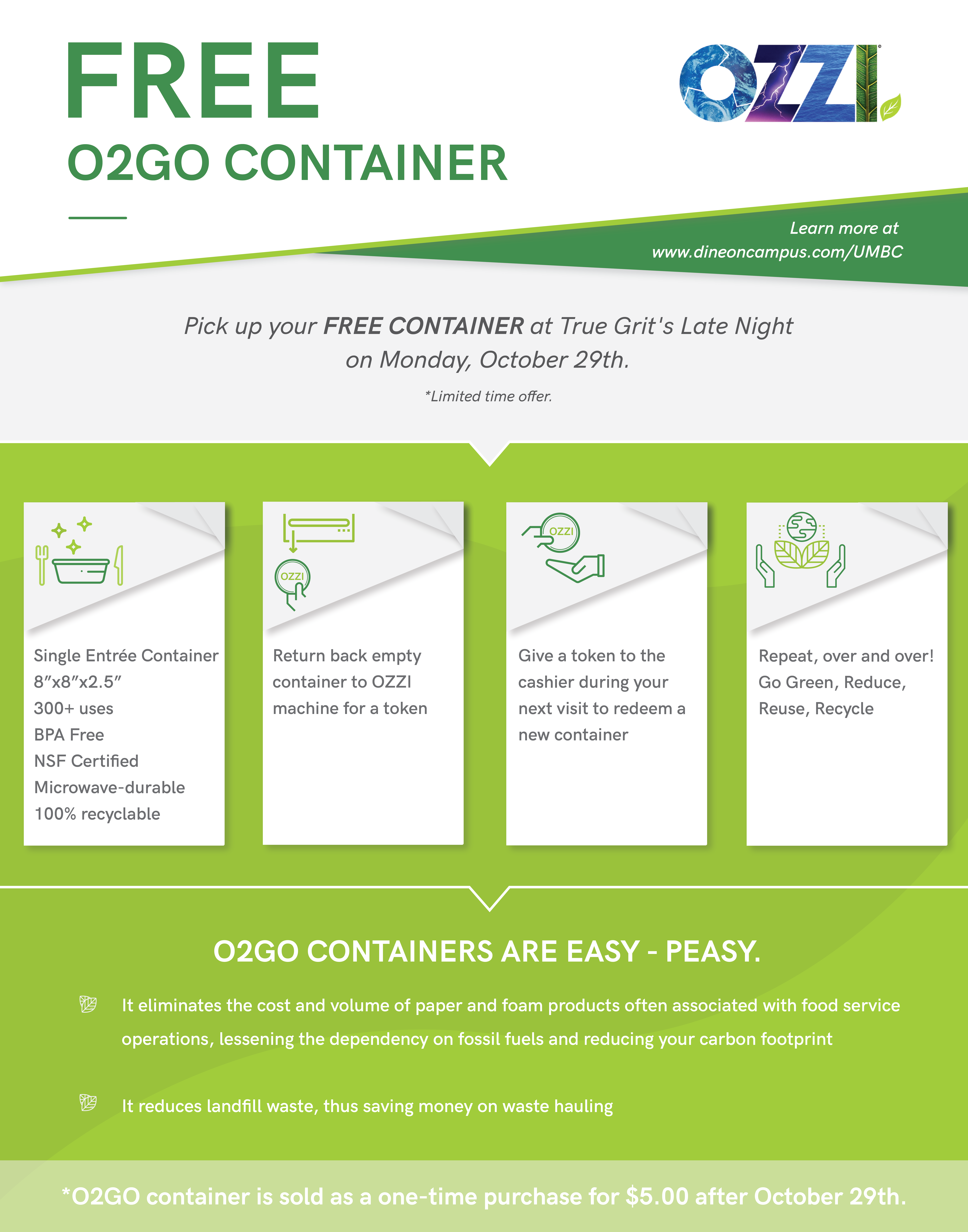 Join us on launch day, Monday October 29th, to pick up your FREE Ozzi container with your meal at True Grit's Late Night! After that, it will be a one-time purchase of $5 that can be paid with Flex, Retriever Dollars, or credit!