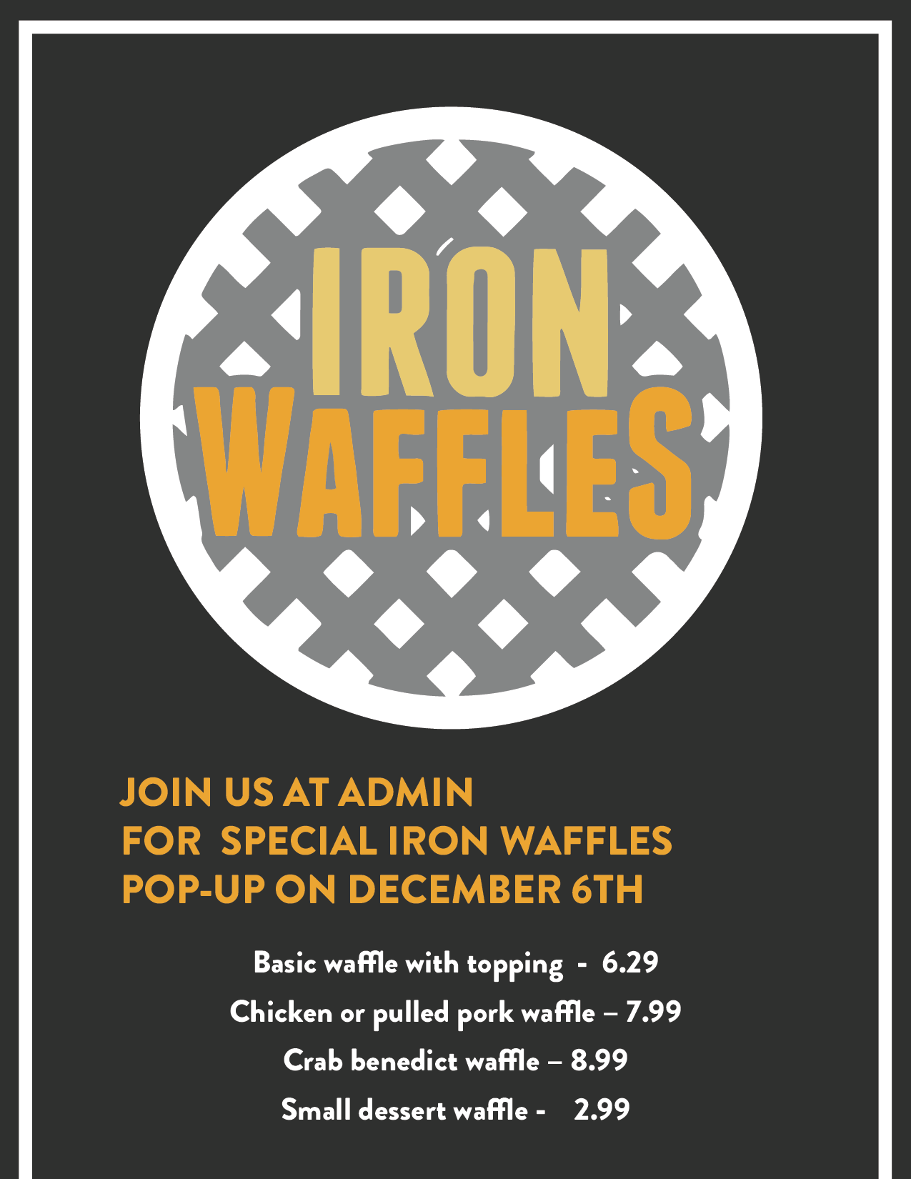 Join us at Admin Coffee Shoppe today from 11am-2pm for our waffle pop-up! We'll be serving up regular, chicken, pulled pork, crab benedict, and dessert waffles!