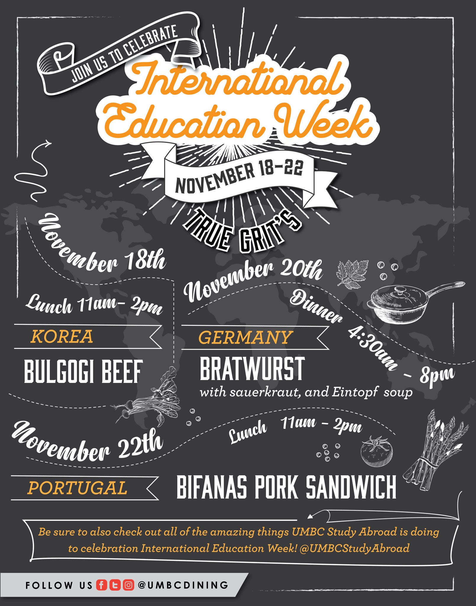 We'll be celebrating International Education Week in True Grit's on November 18-22nd!
