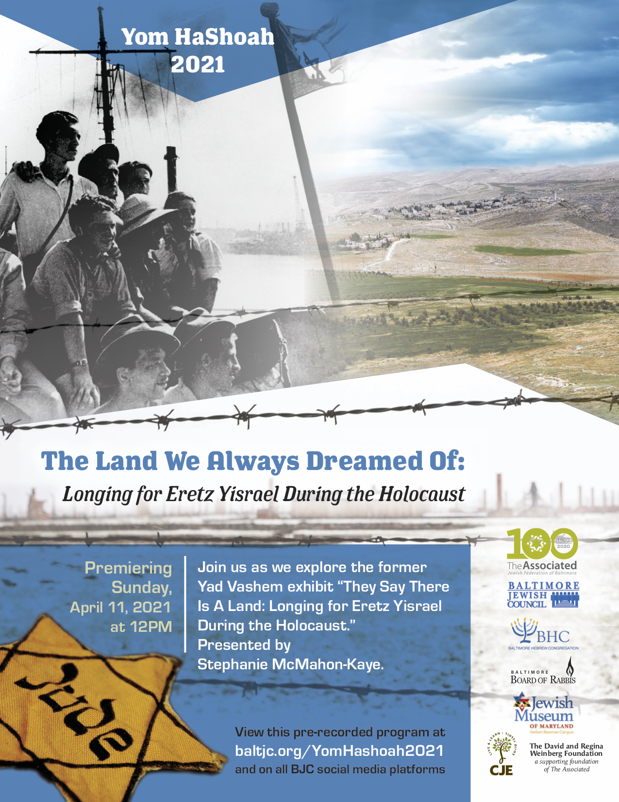Each year the Baltimore Jewish Council brings together Holocaust Survivors from across the region, along with hundreds of others in our community, to commemorate Yom HaShoah. Even when we must be physically distant, we are committed to continuing this tradition as a community. We invite you to join us as we explore the former Yad Vashem exhibit “They Say There Is A Land: Longing for Eretz Yisrael During the Holocaust” presented by Stephanie McMahon-Kaye. This year’s event features a pre-recorded presentation, premiering on their website, and on all of their social media platforms, on Sunday, April 11, 2021 at 12:00 PM.