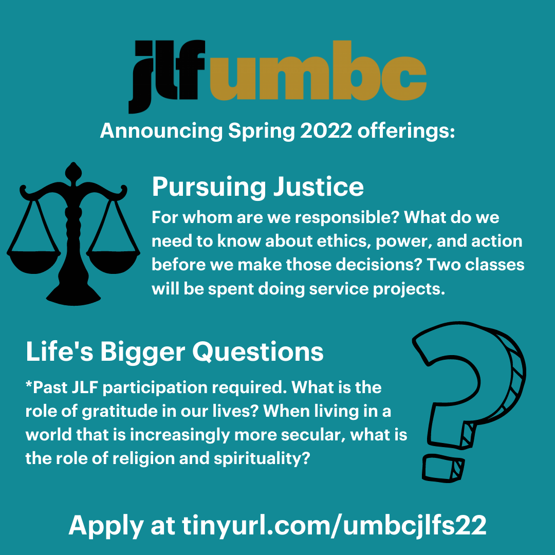 This spring, we are excited to offer JLF: Pursuing Justice and JLF: 2.0 Life's Bigger Questions, starting the week of 2/7. Those that sign up for JLF by the end of the day will get to vote on the meeting day and time for the semester! Learn more and apply here!