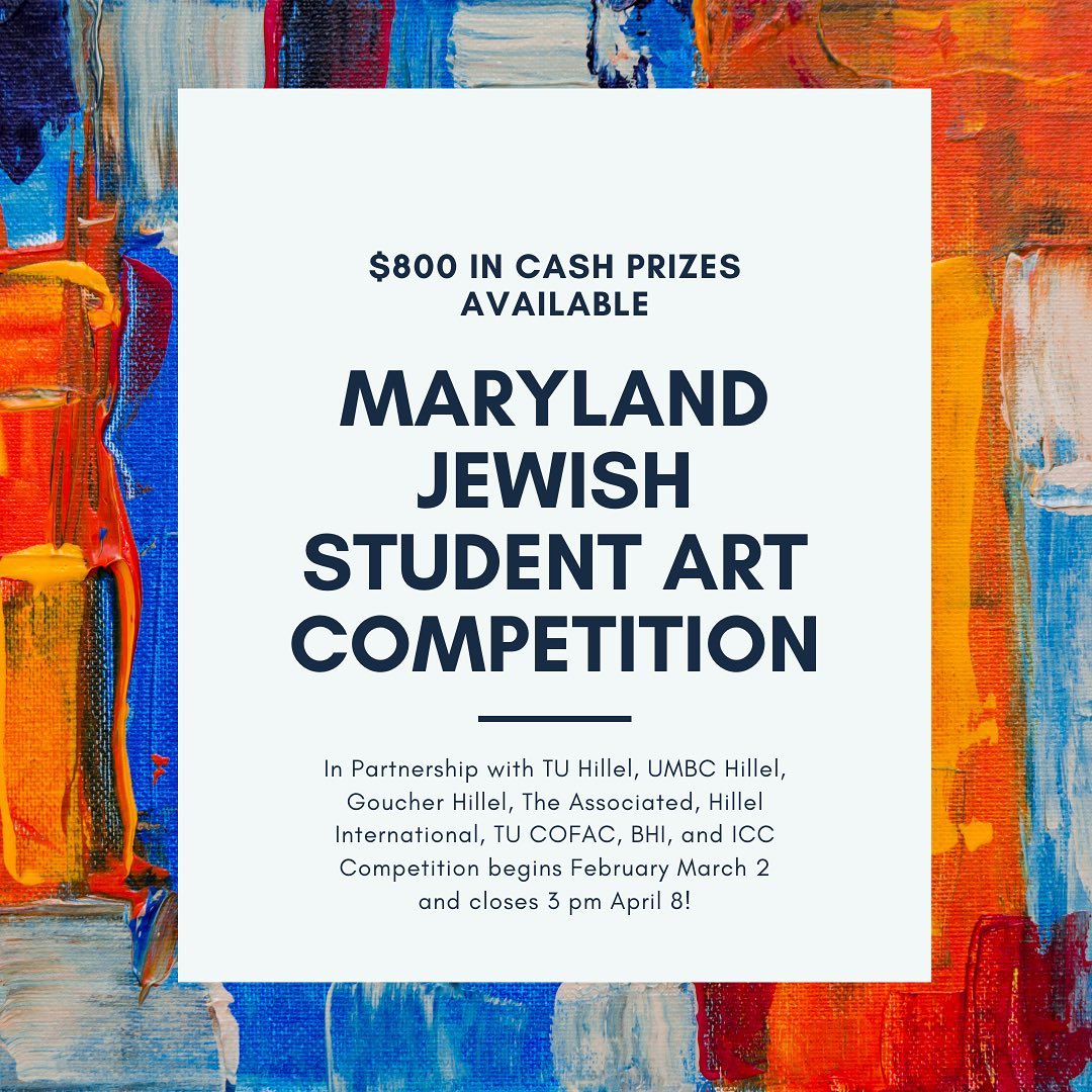 A project in partnership with Towson University Hillel, UMBC Hillel, Goucher Hillel, The Israel on Campus Coalition (ICC) The Associated, Hillel International's Israel Action Program, Baltimore Hebrew Institute, Towson University College of Fine Arts & Communication, this competition aims to engage talented artists studying in Maryland Universities with ideas around Jewish life, learning, and Israel.