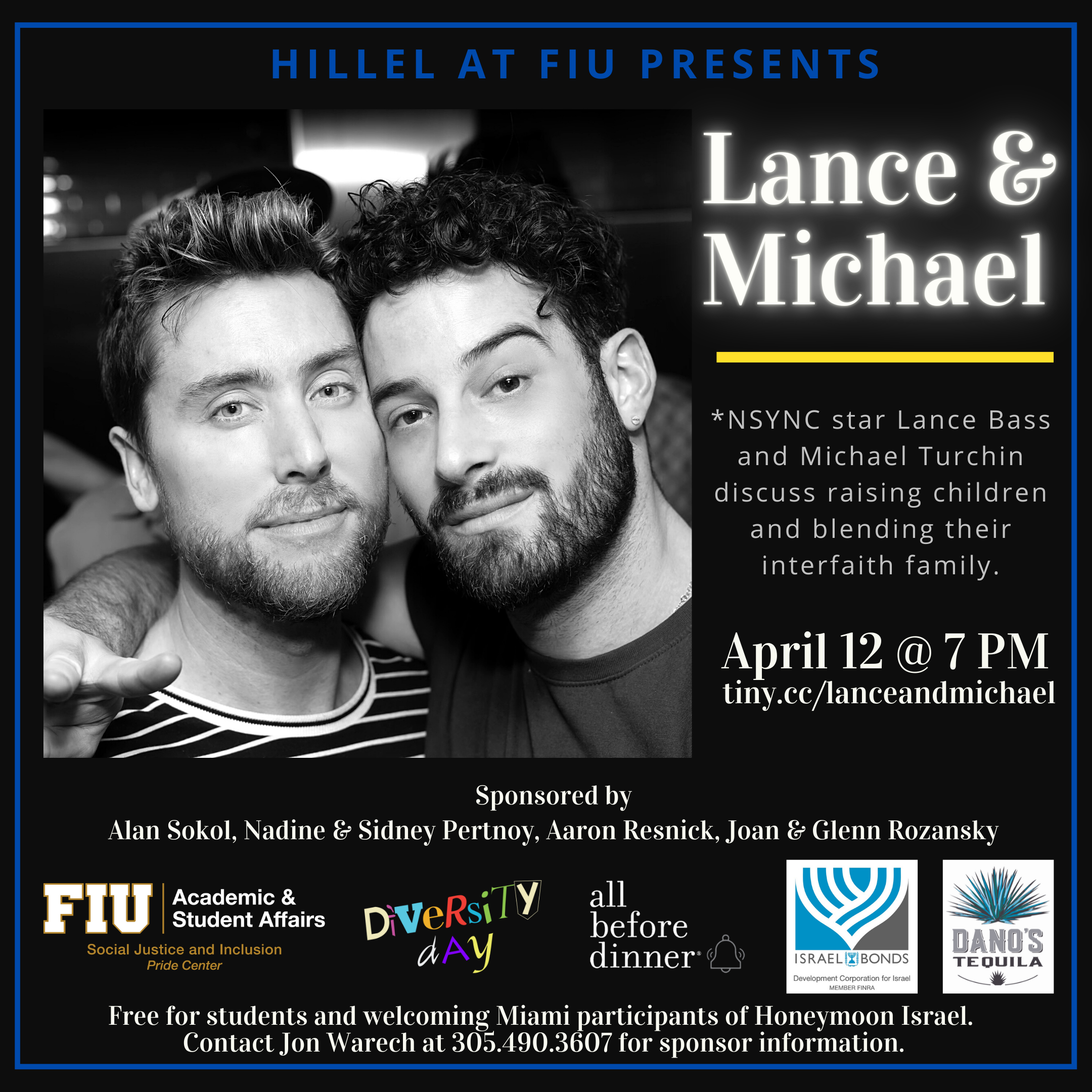 On April 12 at 7pm ET, FIU Hillel is hosting a zoom conversation with *NSYNC star Lance Bass and his Jewish husband Michael Turchin about their interfaith marriage and family. All are invited to attend! Please register at tiny.cc/lanceandmichael.