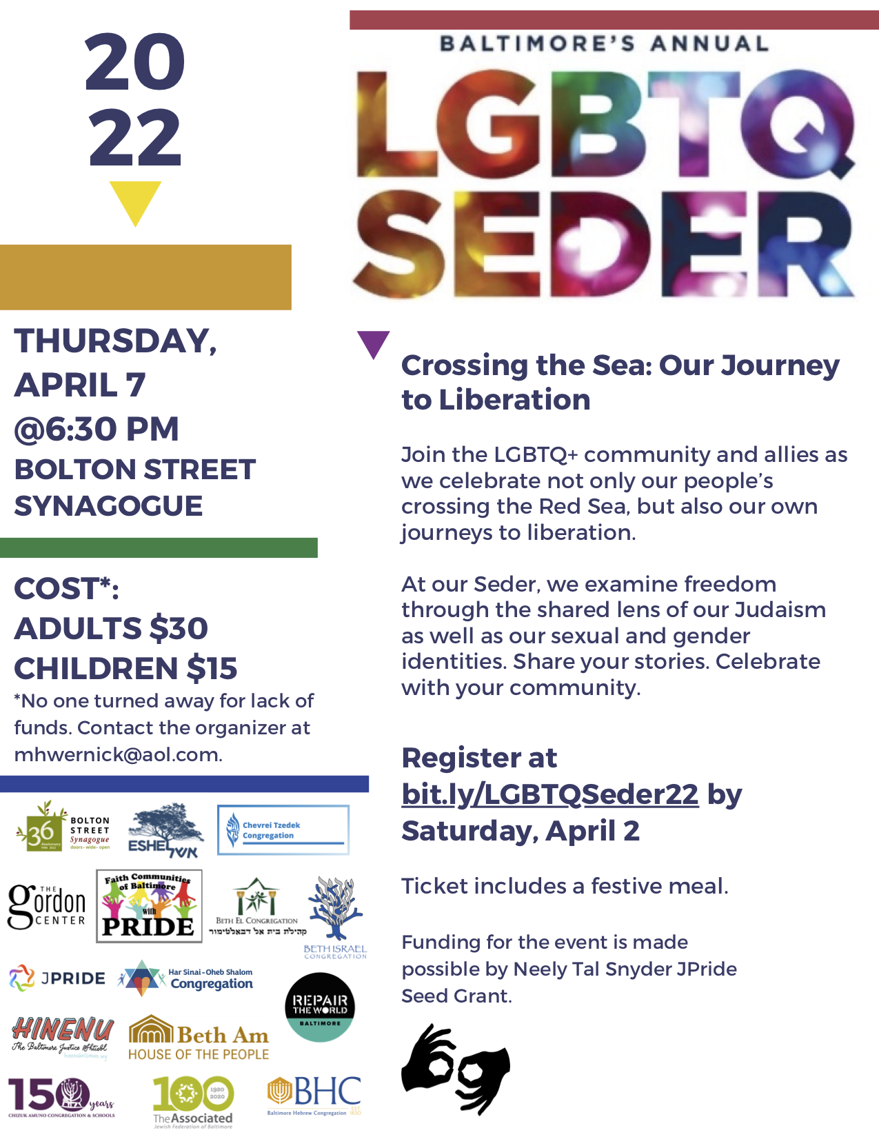 Event is sponsored by The Associated, Baltimore Hebrew Congregation, Beth Am Synagogue, Beth El Congregation, Beth Israel Congregation, Bolton Street Synagogue, Chevrei Tzedek Congregation, Chizuk Amuno, Eshel, Faith Communities of Baltimore with Pride, The Gordon Center, Har Sinai - Oheb Shalom Congregation, Hinenu, and Repair the World.