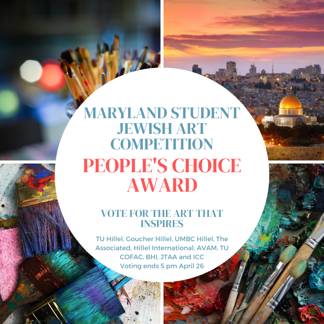 The People's Choice Award for the Second Maryland Student Jewish Art Competition is now open. The winner of the People's Choice Award, chosen by you, will win $100! All art was submitted by students at Maryland universities portraying their connection to Jewish life, learning, and Israel. Vote at https://pollunit.com/polls/mdjewishartcomp