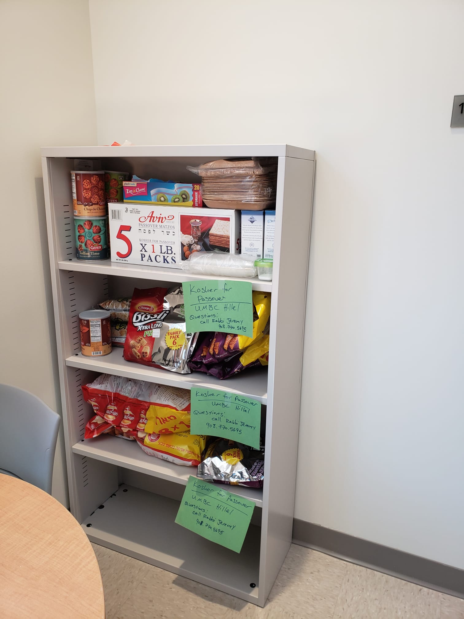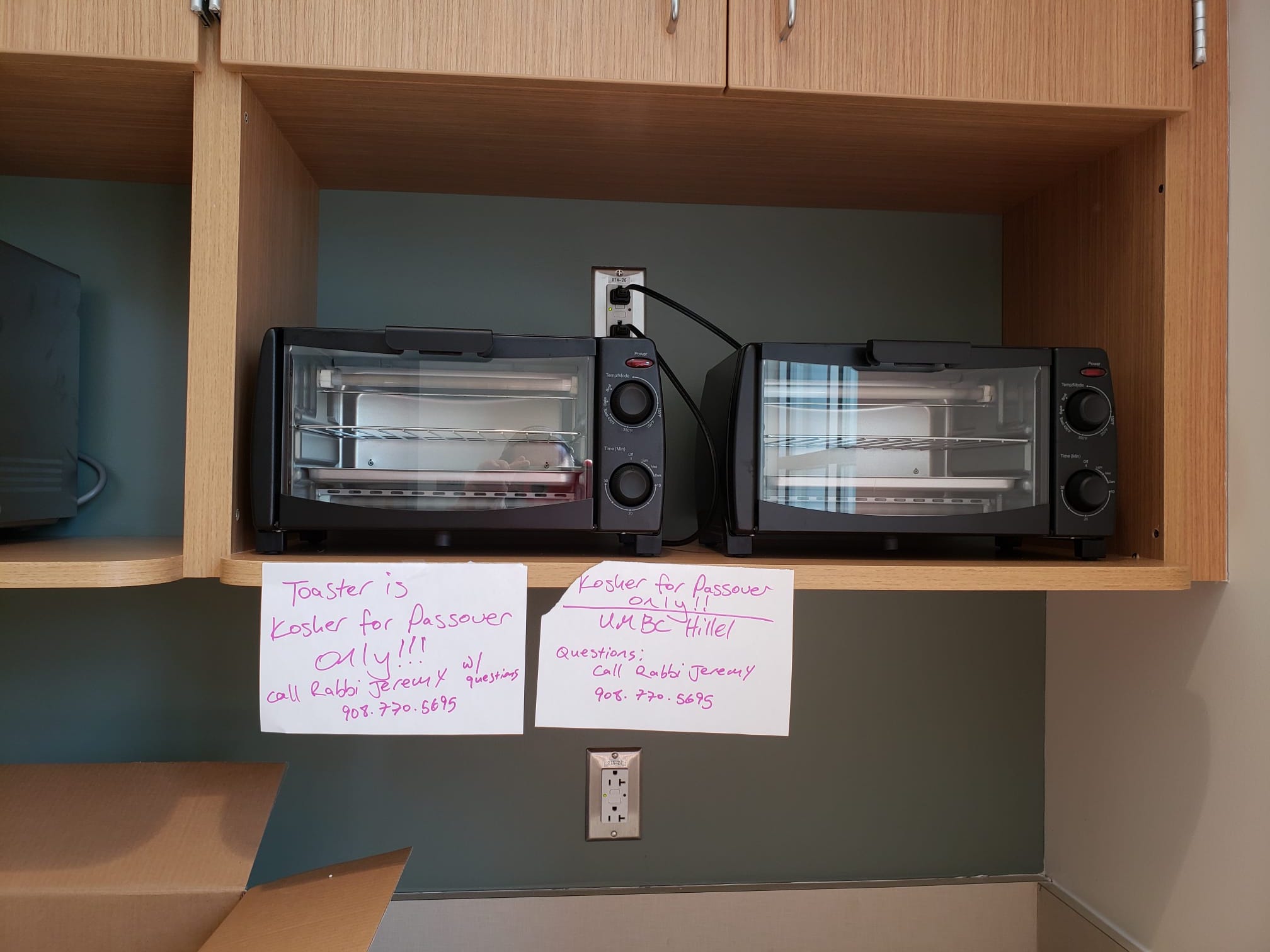 We have been given room 115 in the Center for Well-Being to keep a dairy kosher for Passover toaster oven, as well as certified kosher for Passover food. As seen in the pictures, all items are clearly marked as "UMBC Hillel kosher for Passover." Plasticware and plates are available.