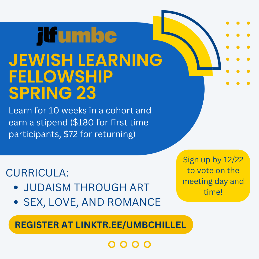 Applications are open for Jewish Learning Fellowship (JLF) for the Spring Semester! We will be offering two curricula this spring: "Judaism as Art" and "Sex, Love, and Romance"