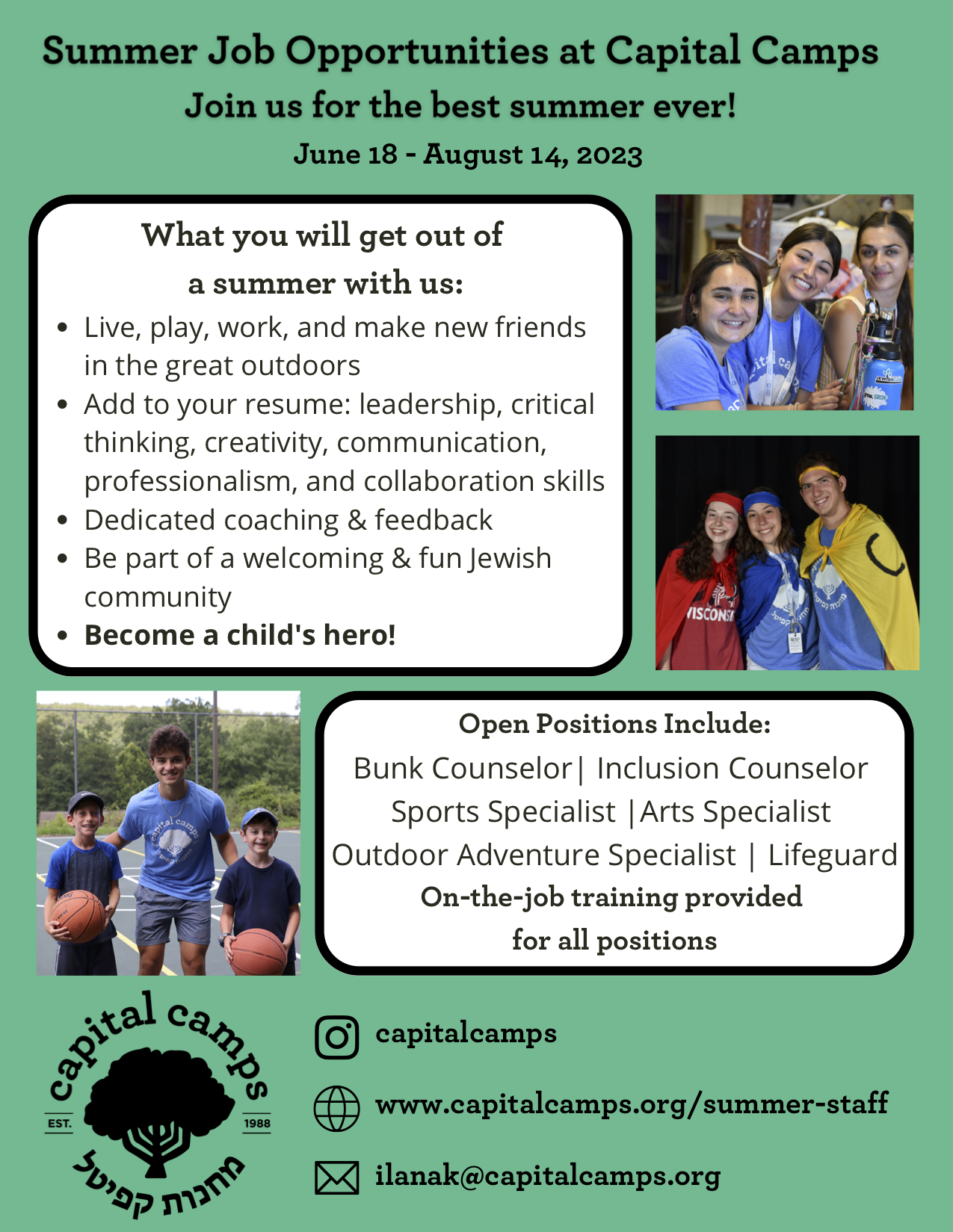 Capital Camps is the premier Jewish community overnight camp in the region. At Capital Camps, we inspire our campers and staff to grow as individuals and to build Jewish communities through meaningful challenges and shared experiences. Capital Camps is brought to life by a summer staff team of approximately 175 individuals with incredibly diverse backgrounds. As a summer staff member at Capital Camps, you’ll receive intentional training and gain opportunities to grow and develop in a wide variety of skills and settings, all while having a ton of fun! Click here to learn more about our summer staff team and to apply: https://capitalcamps.org/summer-staff