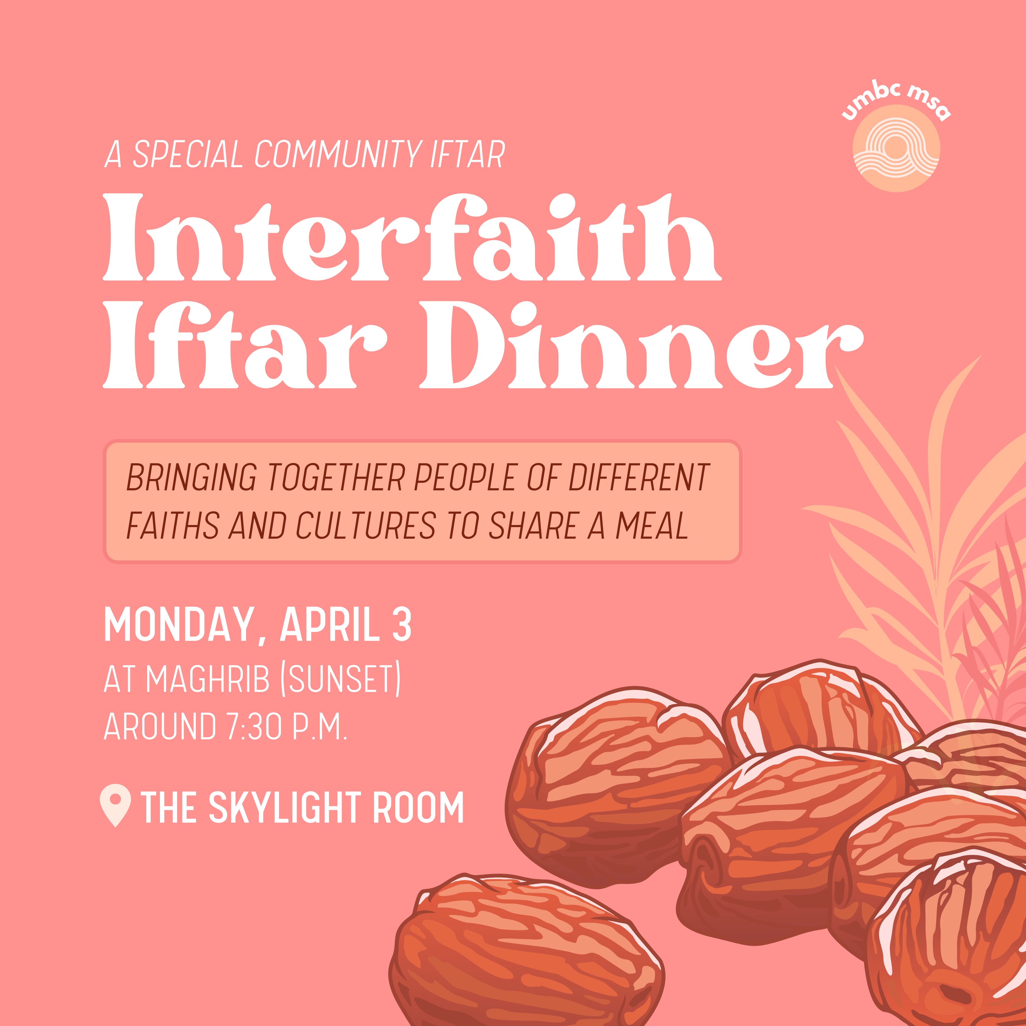 "The UMBC MSA would like to cordially invite you to join us for an interfaith iftar, a special evening meal to break the fast during the holy month of Ramadan. The iftar will bring together people of different faiths and cultures to share a meal and celebrate the diversity of our community.