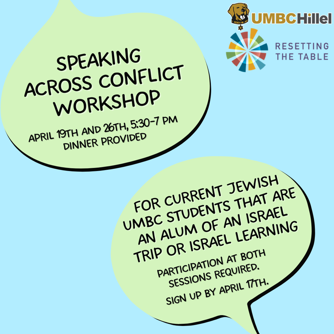 Targeted at current Jewish UMBC students that have participated in an Israel trip or Israel learning, this workshop will offer communication skill-building for charged conversations on Israel and a forum for dialogue across disagreement. Participants will learn and practice strategies of communication that allow them to articulate their views and share their experiences effectively while inviting curiosity, collaboration, and constructive debate.