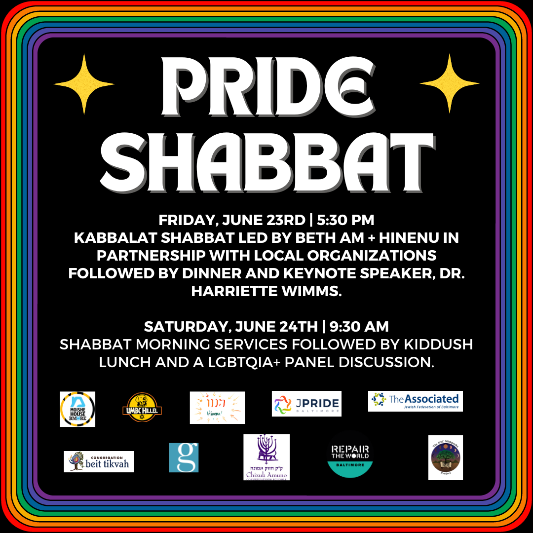 All are invited to Beth Am's Pride Shabbat, in partnership with Hinenu, Baltimore's Justice shtiebl, Repair the World, and many other Jewish and LGBTQ organizations and congregations (including UMBC Hillel)! Register here!