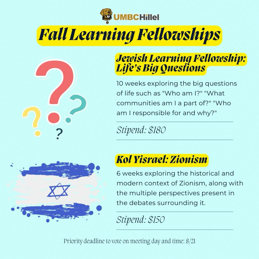 This fall, Hillel will offer two stipended learning fellowships this semester! JLF: Life's Big Questions (targeted at new students, open to everyone) and Kol Yisrael: Zionism. Get PAID to explore self-identity or the intricacies of Zionism with a cohort in a brave space where questions are not only welcome, but encouraged.