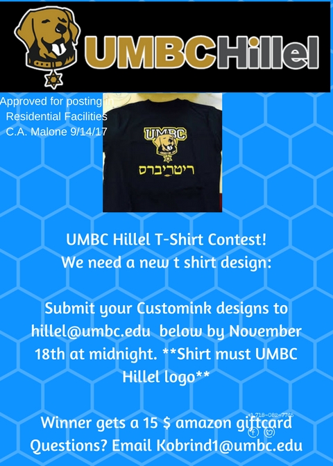 The deadline is November 18th so that is plenty of time to think of ideas and create a design. Submit your designs to hillel@umbc.edu, we will judge them in a fair poll, the winner will recieve a free shirt of their design, and a 15 dollar amazon giftcard :)