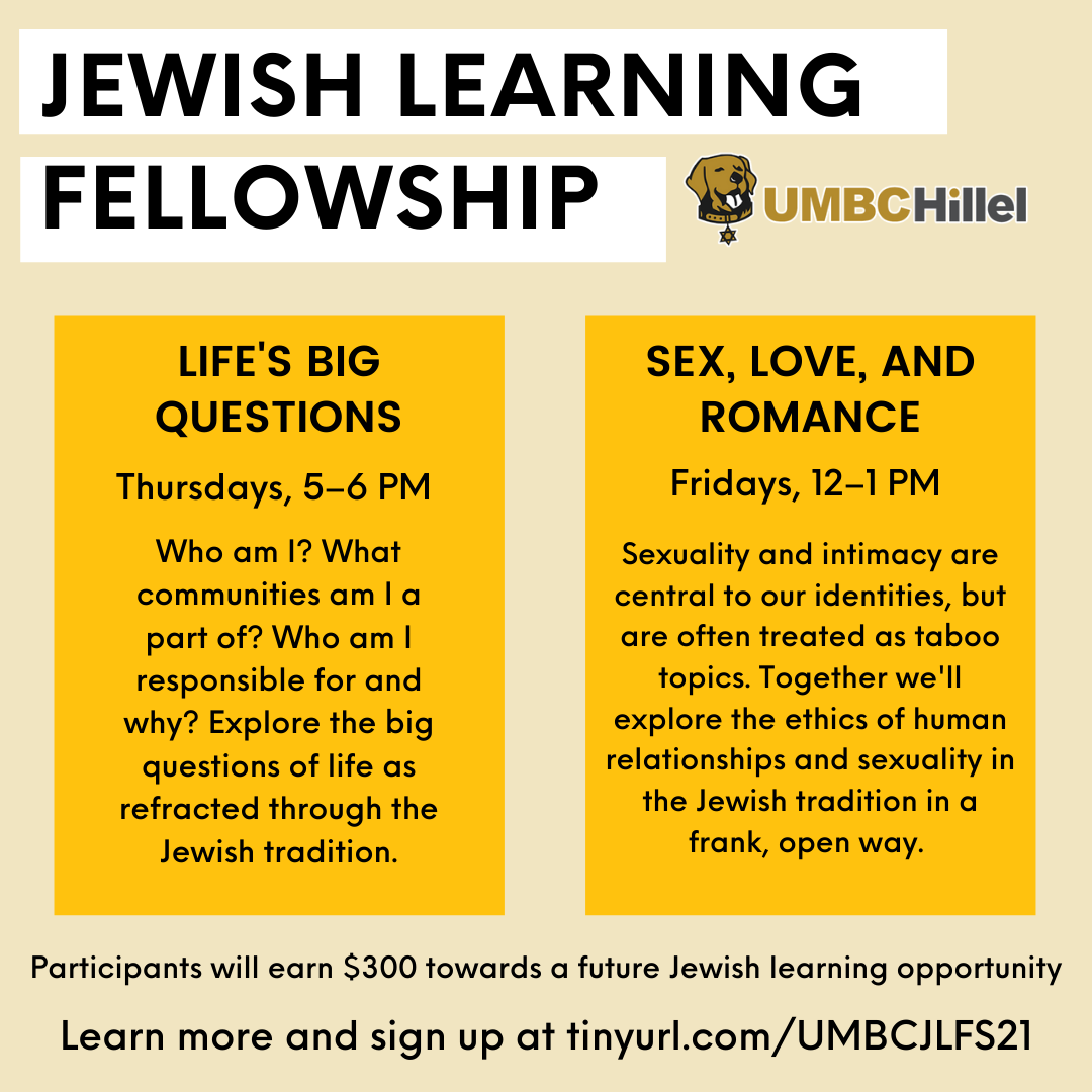 Join us for Jewish Learning Fellowship this semester for 10 weeks of Jewish learning and making new friends. We're offering two cohorts this semester: "Life's Big Questions" (great for freshmen and anyone looking to get their feet wet in learning, but open to everyone) on Thursdays 5–6 PM, or "Sex, Love, and Romance" on Fridays 12–1 PM. A $300 will be awarded upon completion. JLF will be starting this Thursday and Friday, so be sure to sign up soon!