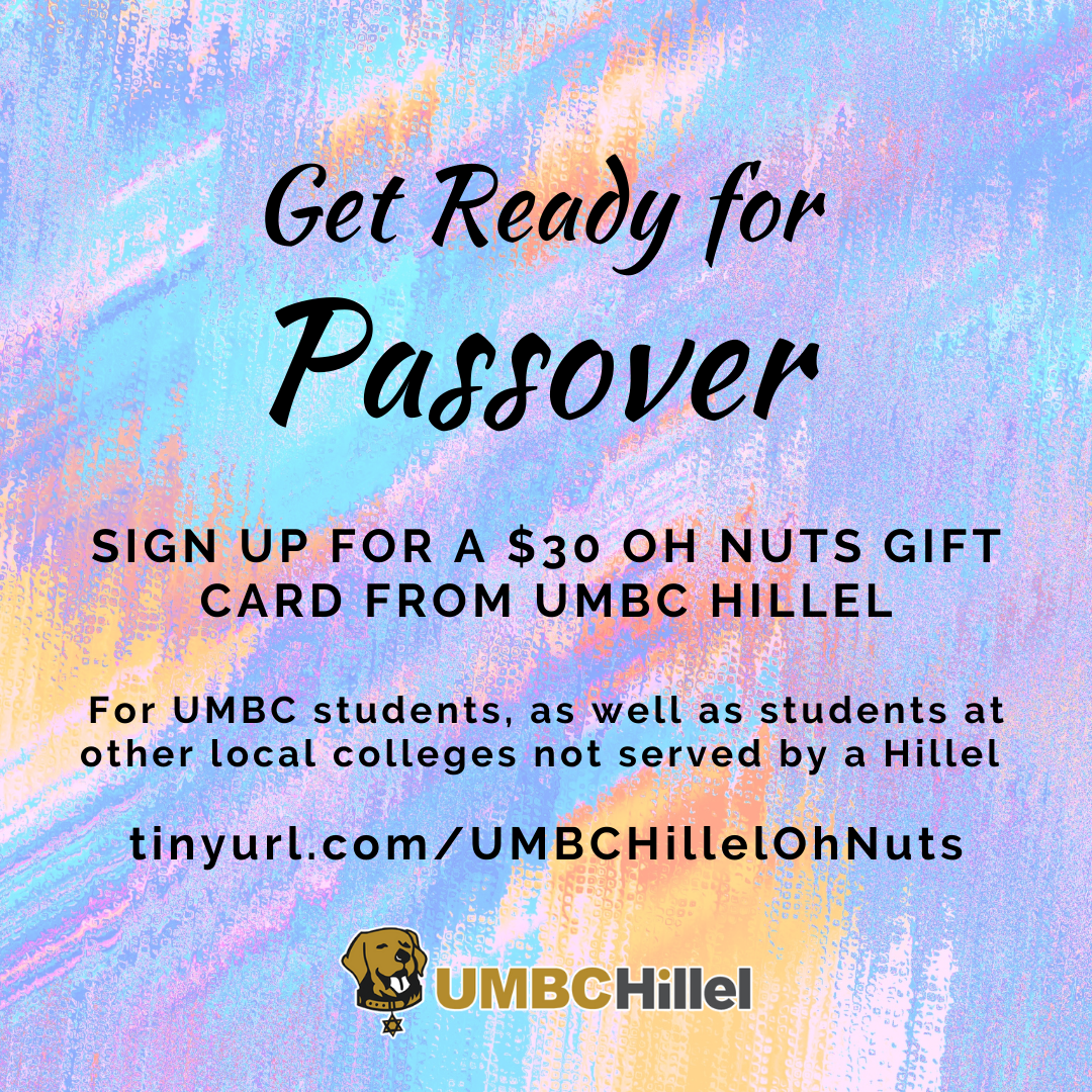 Getting ready for Passover? Let UMBC Hillel help with a $30 gift card to ohnuts.com, where you can buy seder items (seder plate, grape juice, matzah, etc.) and other Kosher for Passover treats! Please sign up here if you'd like a gift card. All are invited, but not obligated, to attend our virtual seder on the first night of Passover (Saturday 3/27, details to come).