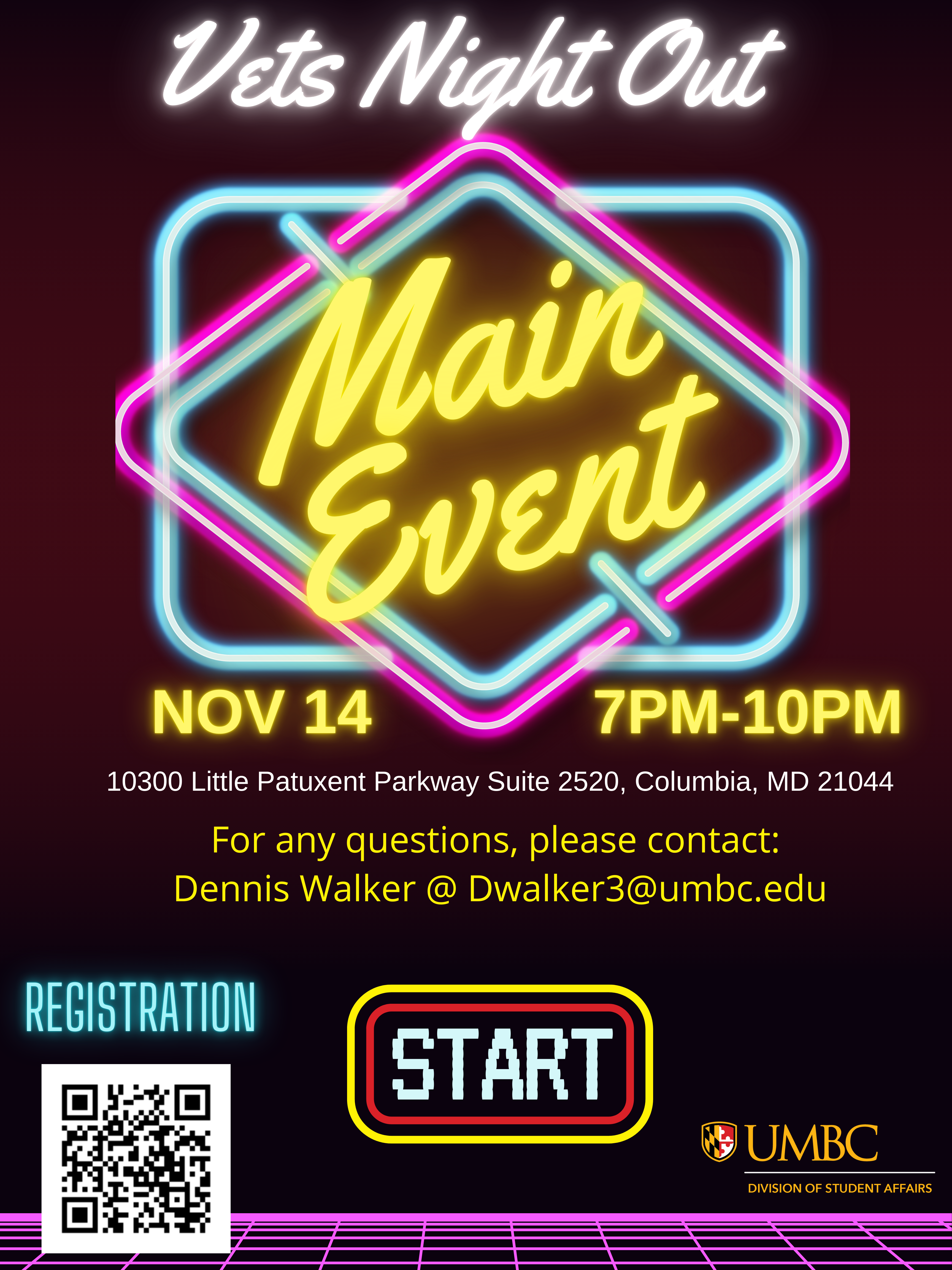 Join us for Vets Night Out: Main Event Columbia this Thursday 11/21 from 6:20 until 10:00, Free Food Free Games and Free Transportation to and from UMBC is included! We only have 3 spots left so sign-up while you can! We look forward to seeing you tomorrow!