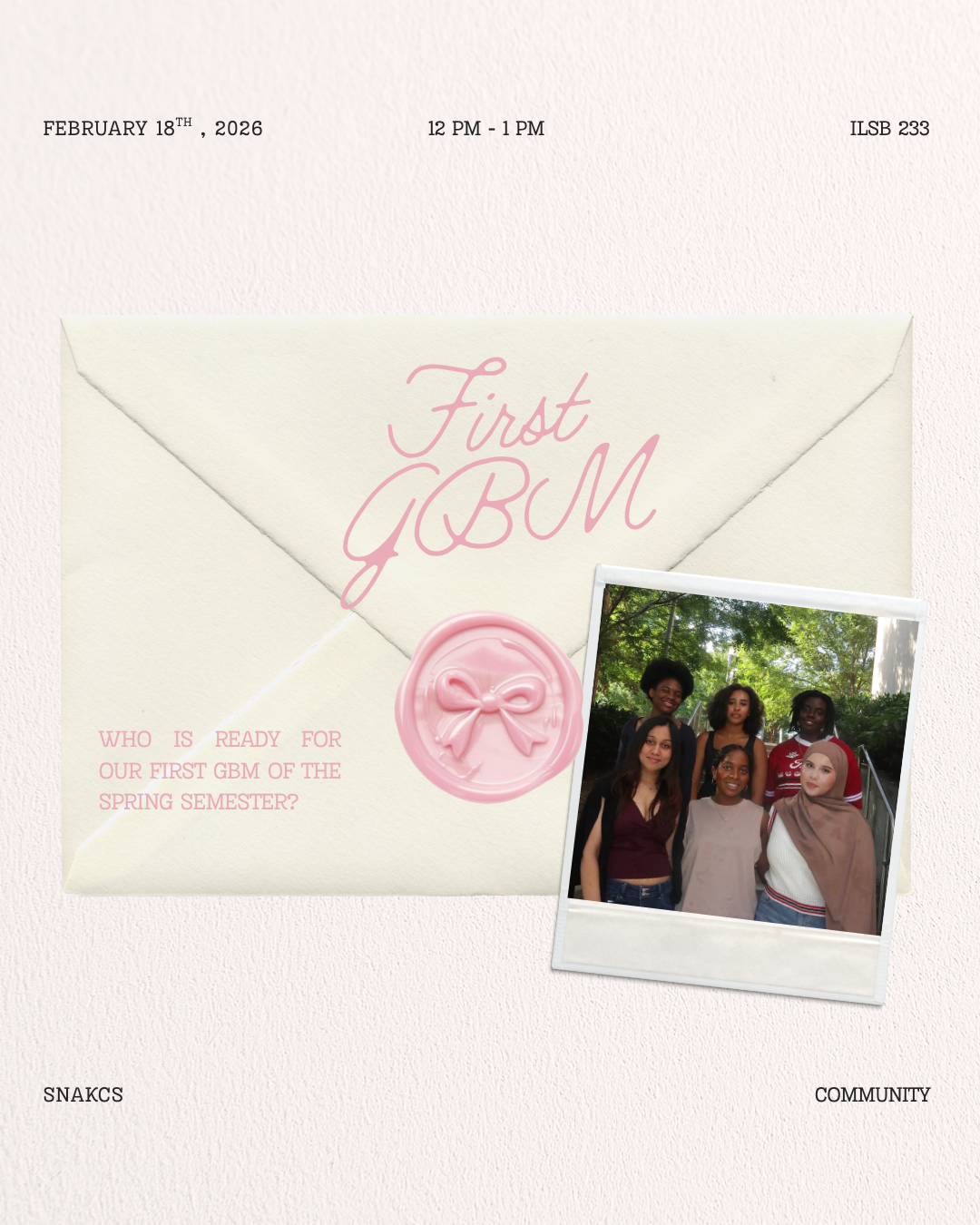 Please join us for our first General Body Meeting on Wednesday, February 18th, from 12 p.m. to 1 p.m in ILSB 233. This is a great opportunity for newcomers (and current members, of course!) to learn more about what we do as we will be discussing our upcoming events and opportunities this year. Bring a friend or two and let's kick this semester off to a great start!