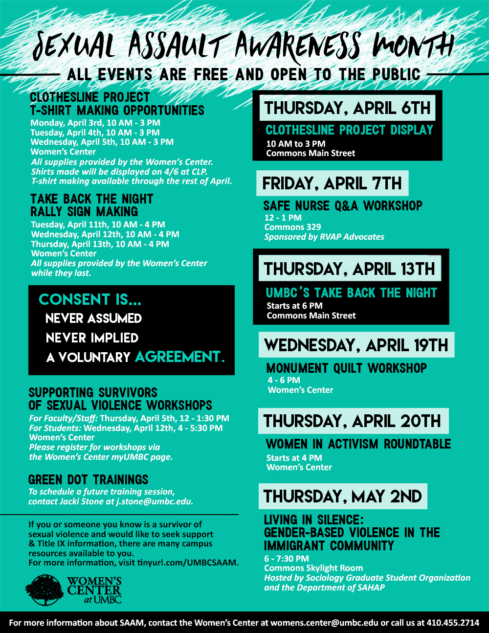 If you have questions about any of the listed events or about sexual assault resources, please contact Jess Myers, Women's Center Director, at jessm@umbc.edu, 410-455-2714.