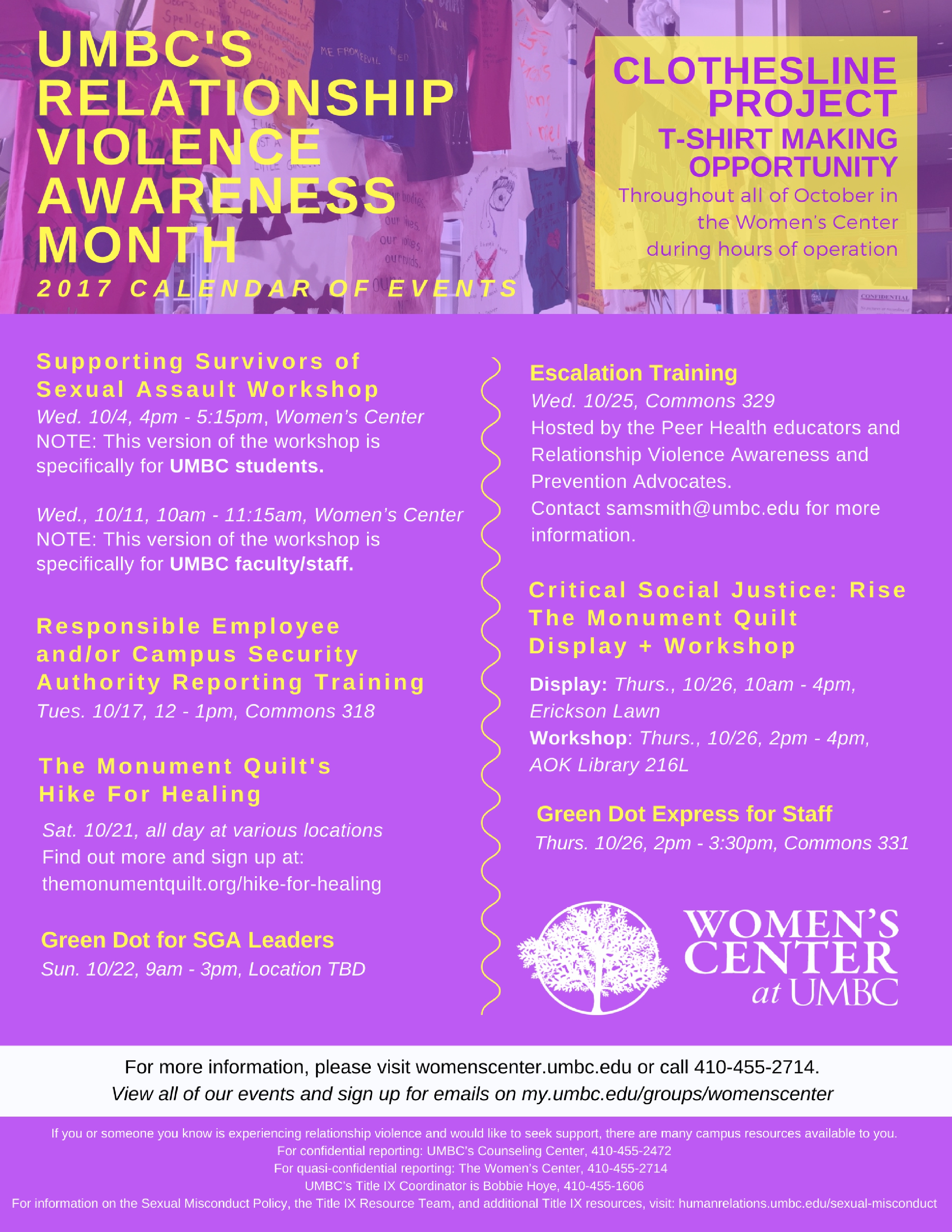 - Clothesline Project t-shirt making is available all of October in the Women's Center. For more details on the Clothesline Project, visit the Women's Center myUMBC page.