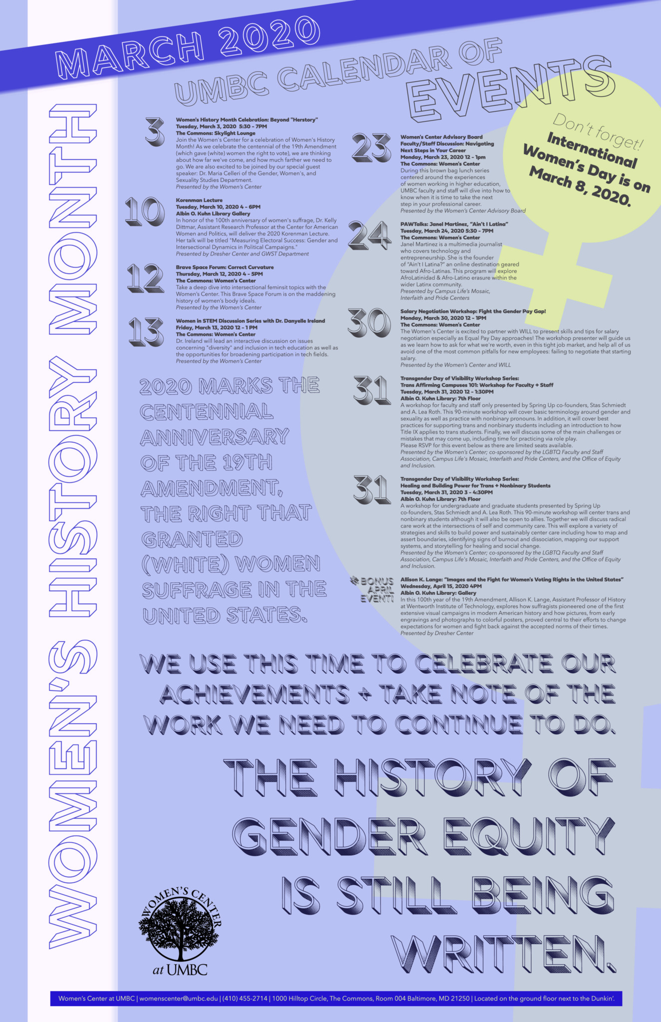 For a list of all the campus events, download the calendar below. Follow the Women's Center on Facebook, Twitter, and Instagram for updates throughout the month.