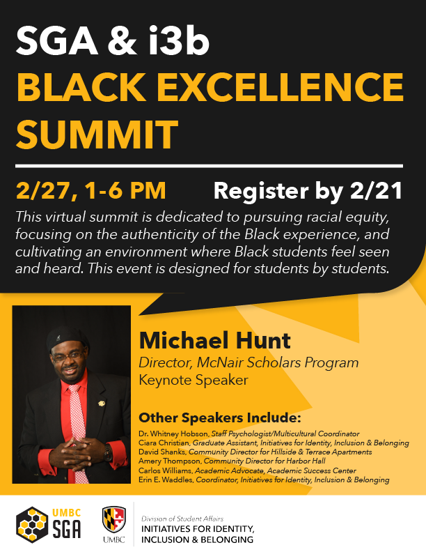 The Black Excellence Summit hosted in collaboration with the Student Government Association (SGA), Initiatives for Identity, Inclusion & Belonging (i3b), Office of Equity and Inclusion (OEI), Africana Studies Department, National Society of Black Engineers (NSBE), Alpha Phi Alpha Fraternity, CURL P.W.R, the Women's Center, and the Faithful Black Men Association (FBMA). This event is a virtual summit taking place on February 27th, 2021 through Webex from 1:00 pm - 6:00 pm.